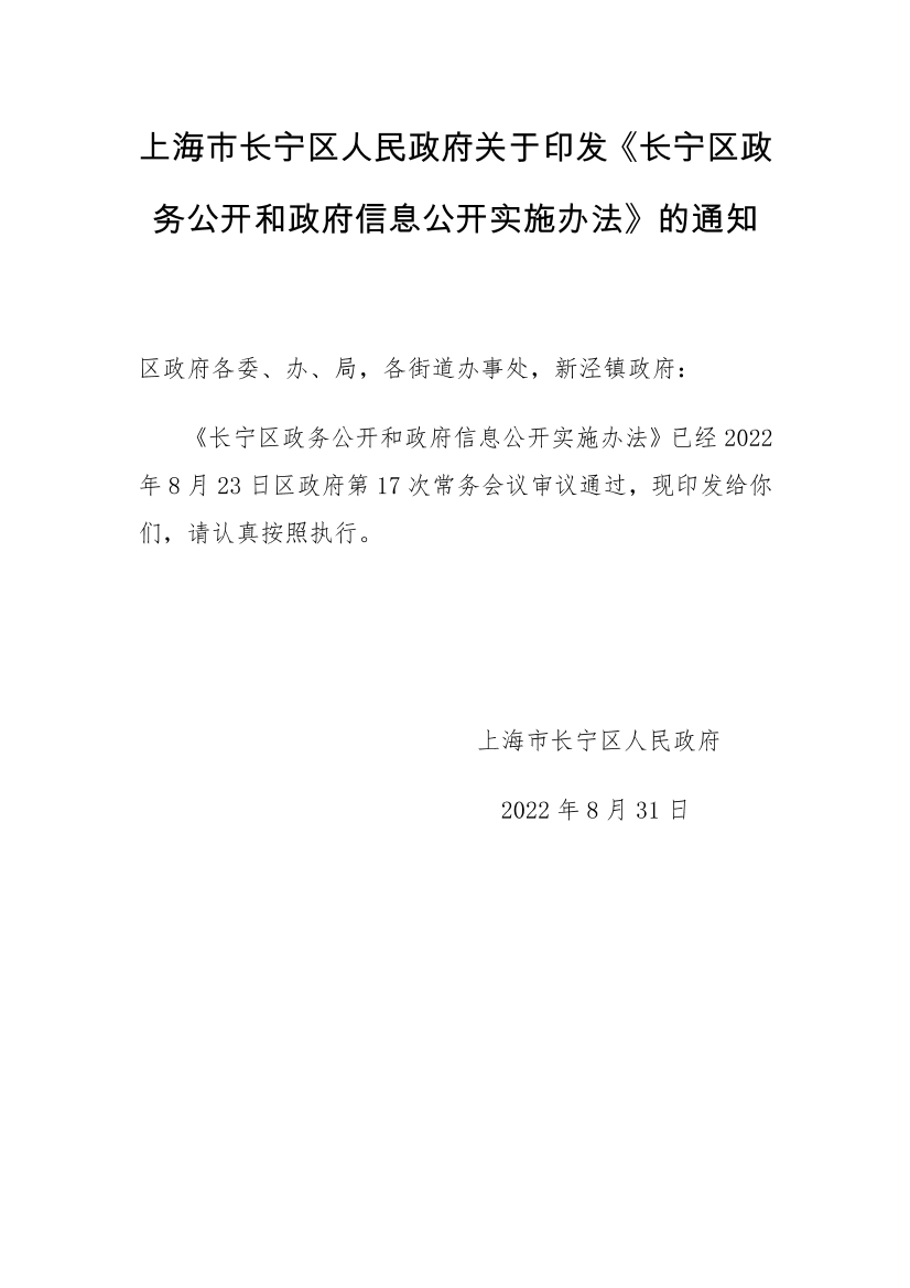 《长宁区政务公开和政府信息公开实施办法》已经2022年8月23日区政府第17次常务会议审议通过,现印发给你们,请认真按照执行。