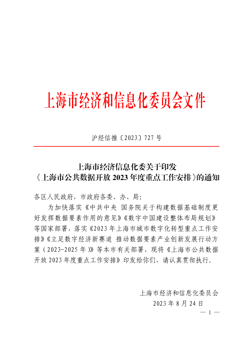 为加快落实《中共中央 国务院关于构建数据基础制度更好发挥数据要素作用的意见》《数字中国建设整体布局规划》等国家部署,落实《2023年上海市城市数字化转型重点工作安排》《立足数字经济新赛道 推动数据要素产业创新发展行动方案(2023-2025年)》等本市有关部署,现将《上海市公共数据开放2023年度重点工作安排》印发给你们,请认真贯彻执行。