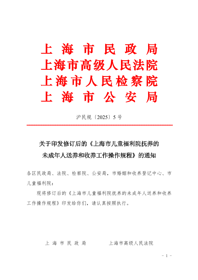 本规程自2025年3月1日起实施,有效期至2030年2月28日。《上海市民政局 上海市高级人民法院 上海市人民检察院 上海市公安局关于印发〈上海市儿童福利院抚养的未成年人送养和收养工作操作规程〉的通知》(沪民规〔2020〕9号)同时废止。