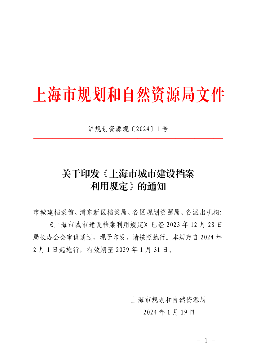 《上海市城市建设档案利用规定》已经2023年12月28日局长办公会审议通过,现予印发,请按照执行。本规定自2024年2月1日起施行,有效期至2029年1月31日。