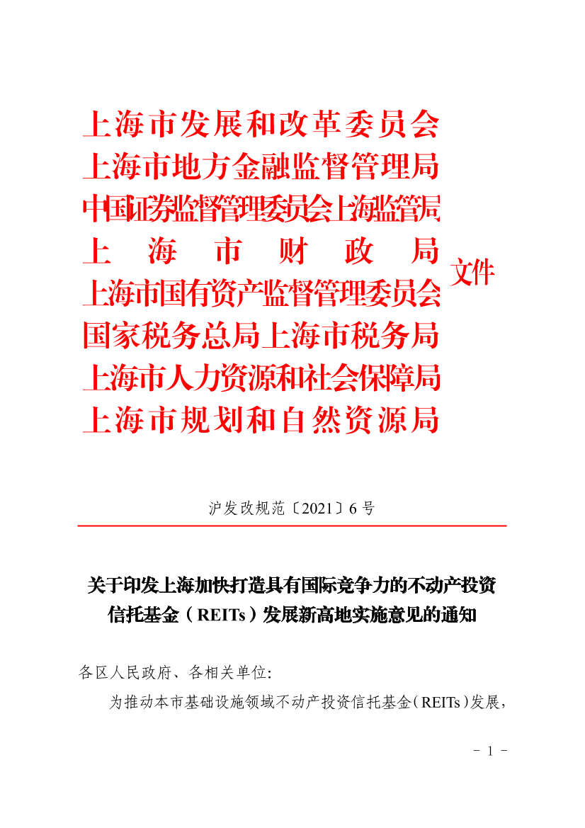 为推动本市基础设施领域不动产投资信托基金(REITs)发展,加快提升上海国际金融中心能级,特制定《关于上海加快打造具有国际竞争力的不动产投资信托基金(REITs)发展新高地的实施意见》,经市政府同意,现印发给你们,请结合实际认真落实。