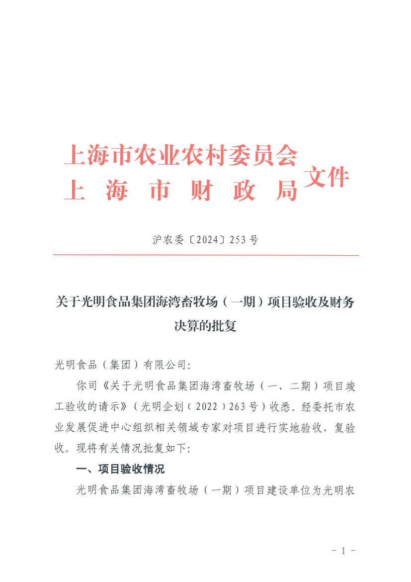 你司《关于光明食品集团海湾畜牧场(一、二期)项目竣工验收的请示》(光明企划﹝2022﹞263号)收悉。经委托市农业发展促进中心组织相关领域专家对项目进行实地验收、复验收。现将有关情况批复如下: