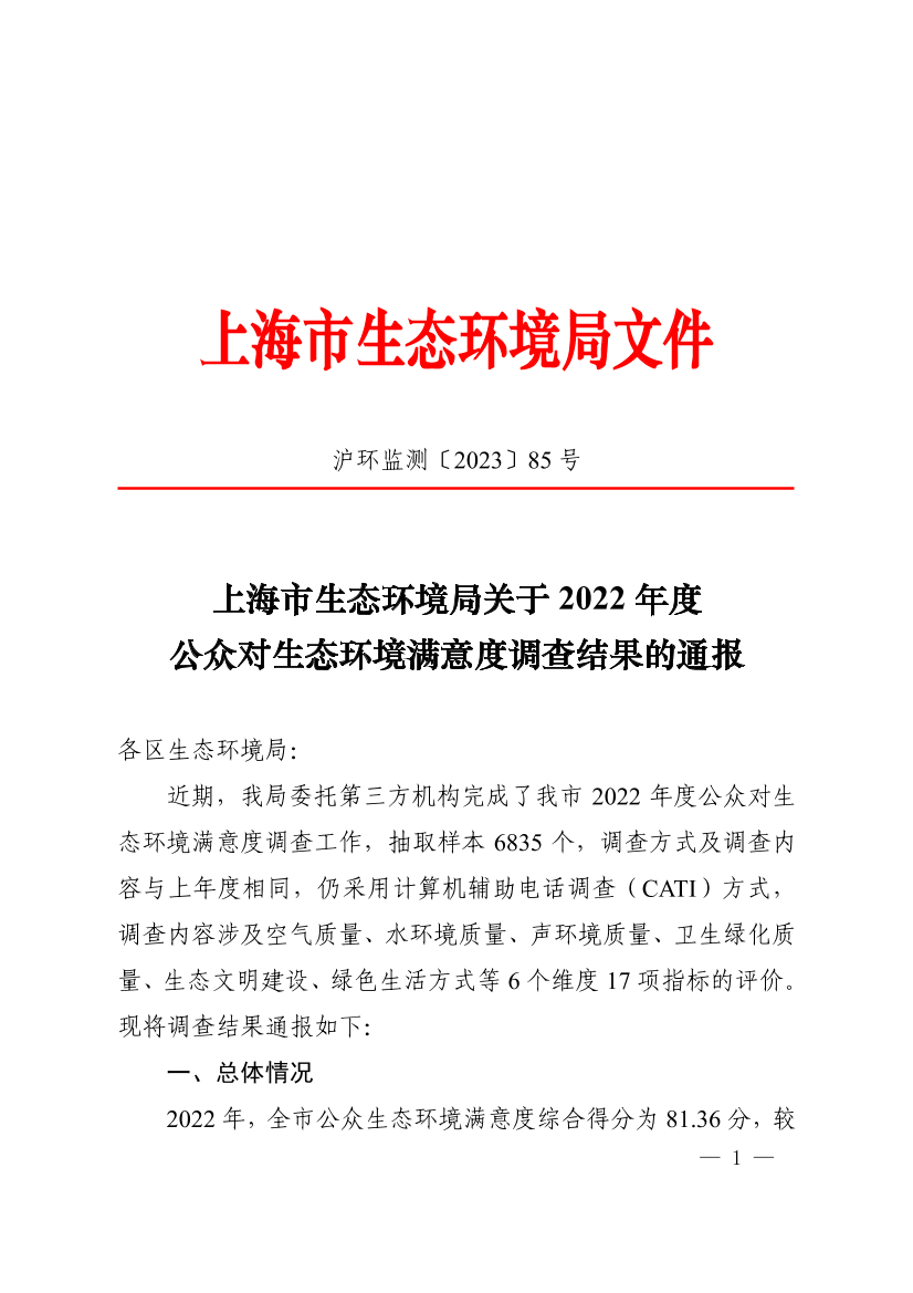 近期,我局委托第三方机构完成了我市2022年度公众对生态环境满意度调查工作,抽取样本6835个,调查方式及调查内容与上年度相同,仍采用计算机辅助电话调查(CATI)方式,调查内容涉及空气质量、水环境质量、声环境质量、卫生绿化质量、生态文明建设、绿色生活方式等6个维度17项指标的评价。现将调查结果通报如下: