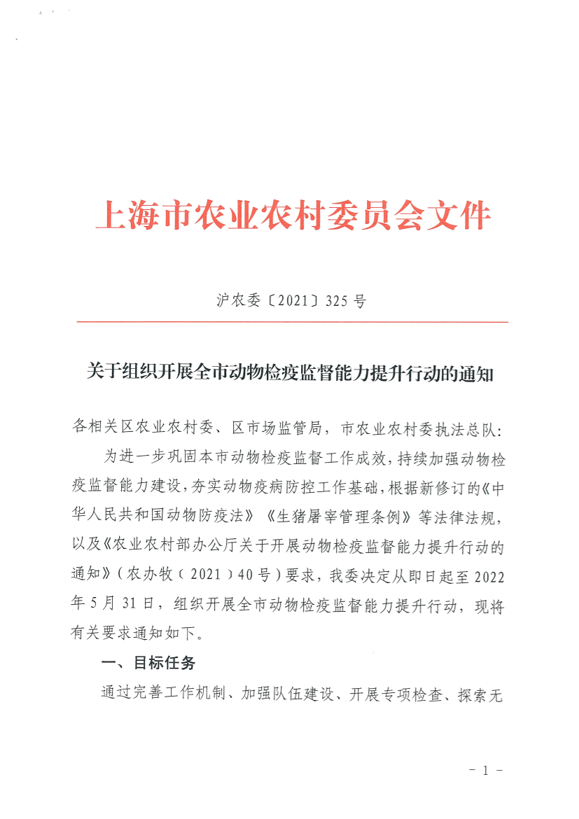 为进一步巩固本市动物检疫监督工作成效,持续加强动物检疫监督能力建设,夯实动物疫病防控工作基础,根据新修订的《中华人民共和国动物防疫法》《生猪屠宰管理条例》等法律法规,以及《农业农村部办公厅关于开展动物检疫监督能力提升行动的通知》(农办牧﹝2021﹞40号)要求,我委决定从即日起至2022年5月31日,组织开展全市动物检疫监督能力提升行动,现将有关要求通知如下。