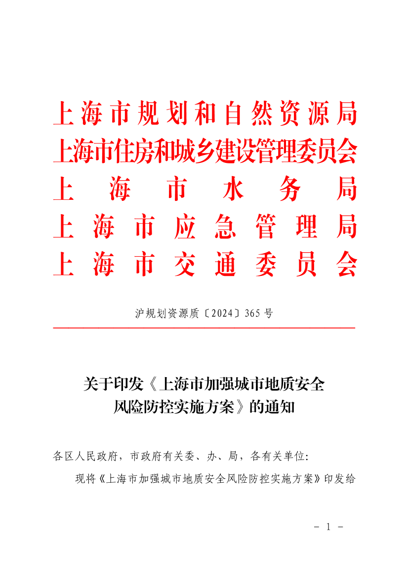 为加强城市地质安全风险防控,有效防范和坚决遏制重特大地质安全事故发生,维护人民群众生命财产安全,根据《自然资源部 住房城乡建设部 水利部 应急管理部关于加强城市地质安全风险防控的通知》(自然资发〔2024〕19号),结合上海实际,制定本实施方案。