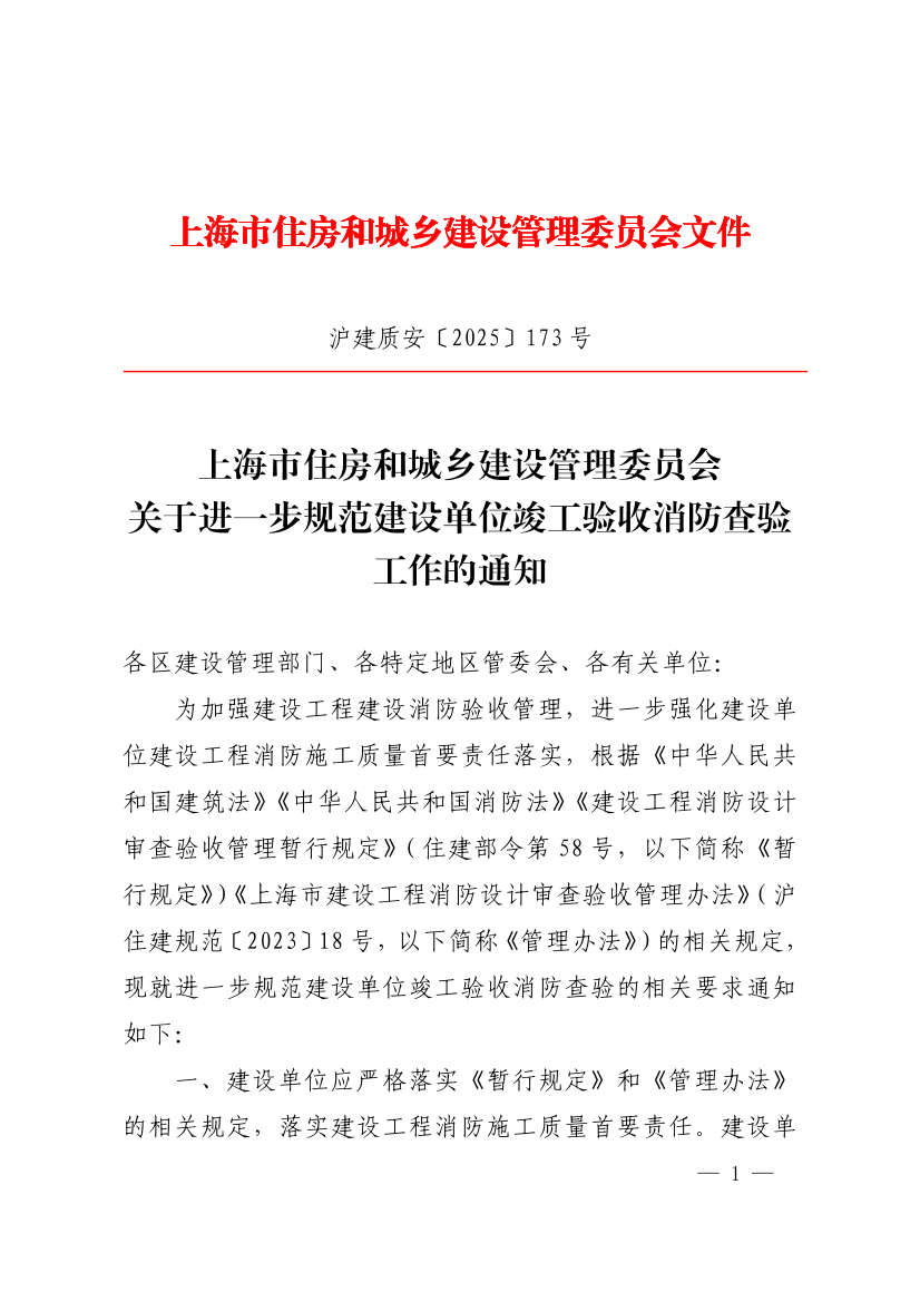 为加强建设工程建设消防验收管理,进一步强化建设单位建设工程消防施工质量首要责任落实,根据《中华人民共和国建筑法》《中华人民共和国消防法》《建设工程消防设计审查验收管理暂行规定》(住建部令第58号,以下简称《暂行规定》)《上海市建设工程消防设计审查验收管理办法》(沪住建规范〔2023〕18号,以下简称《管理办法》)的相关规定,现就进一步规范建设单位竣工验收消防查验的相关要求通知如下: