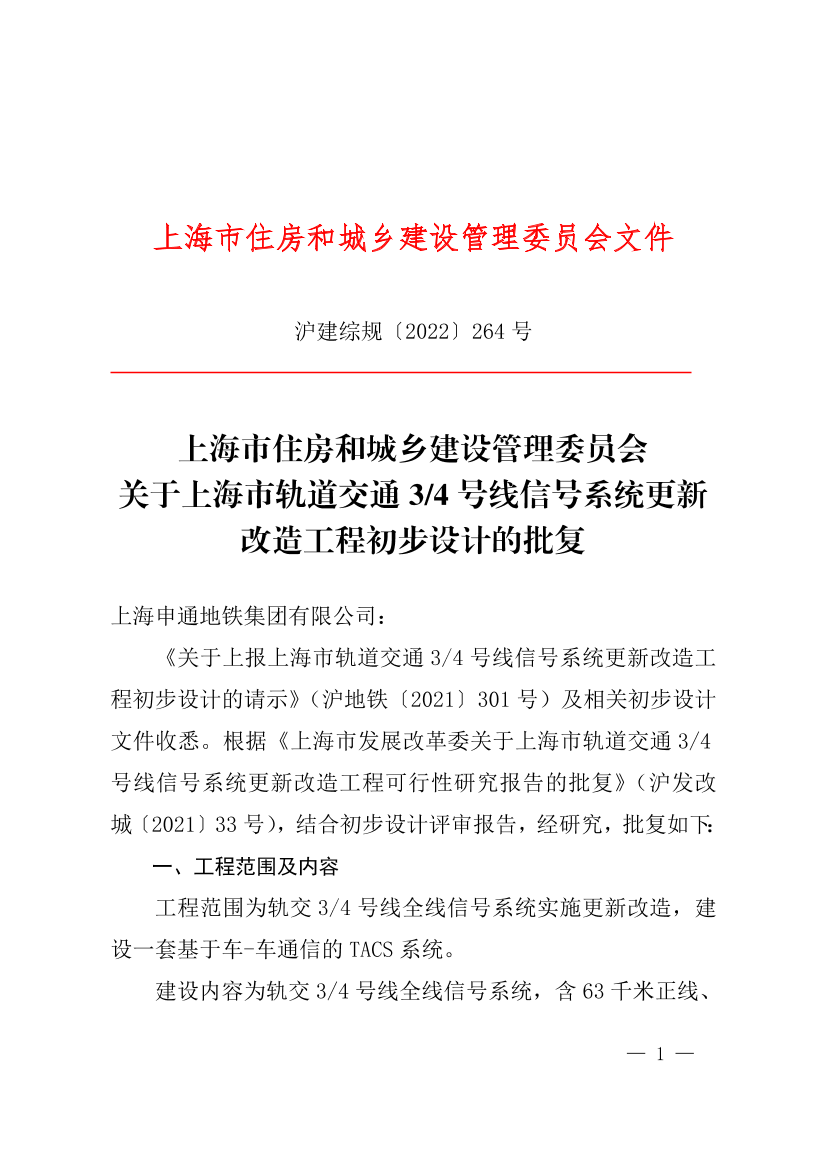 《关于上报上海市轨道交通 3/4 号线信号系统更新改造工程初步设计的请示》(沪地铁〔2021〕301号)及相关初步设计文件收悉。根据《上海市发展改革委关于上海市轨道交通3/4号线信号系统更新改造工程可行性研究报告的批复》(沪发改城〔2021〕33 号),结合初步设计评审报告,经研究,批复如下: