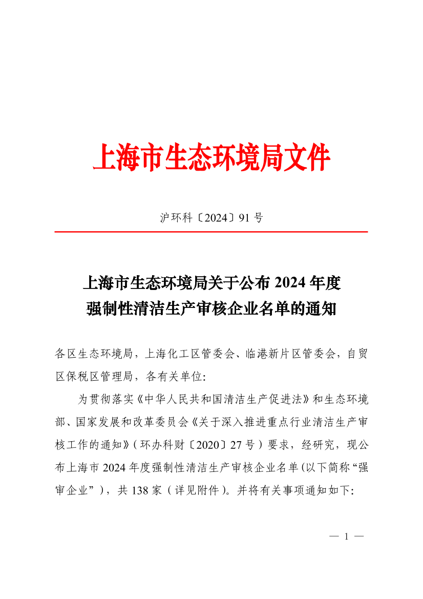 为贯彻落实《中华人民共和国清洁生产促进法》和生态环境部、国家发展和改革委员会《关于深入推进重点行业清洁生产审核工作的通知》(环办科财〔2020〕27号)要求,经研究,现公布上海市2024年度强制性清洁生产审核企业名单(以下简称“强审企业”),共138家(详见附件)。并将有关事项通知如下: