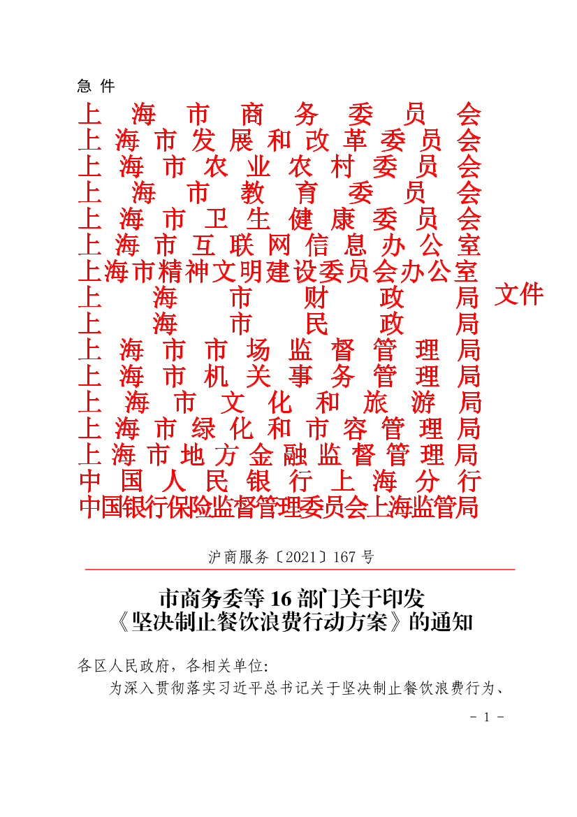 为深入贯彻习近平总书记重要指示批示精神,落实党中央、国务院决策部署,根据《商务部等14部门关于坚决制止餐饮浪费的指导意见》(商服贸发〔2021〕20号),为切实制止餐饮重点领域和各环节的浪费,推动本市餐饮行业形成节约适度、绿色低碳、文明健康的餐饮消费新风尚,特制定方案如下。