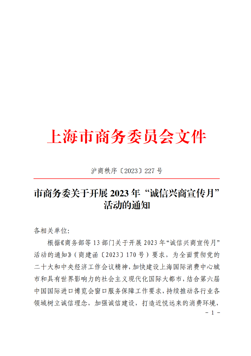 根据《商务部等13部门关于开展2023年“诚信兴商宣传月”活动的通知》(商建函〔2023〕170号)要求,为全面贯彻党的二十大和中央经济工作会议精神,加快建设上海国际消费中心城市和具有世界影响力的社会主义现代化国际大都市,结合第六届中国国际进口博览会窗口服务保障工作要求,持续推动各行业各领域树立诚信理念,加强诚信建设,打造近悦远来的消费环境,市商务委会同市委宣传部、市高院、市发展改革委、市交通委、市文化旅游局、市国资委、上海海关、市税务局、市市场监管局、国家外汇管理局上海市分局、市贸促会、市消保委等部门,定于2023年9月,在本市开展“诚信兴商宣传月”活动。现将有关事项通知如下: