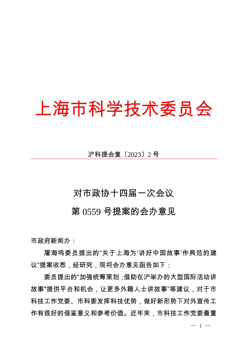 屠海鸣委员提出的“关于上海为‘讲好中国故事’作典范的建议”提案收悉,经研究,现将会办意见函告如下: