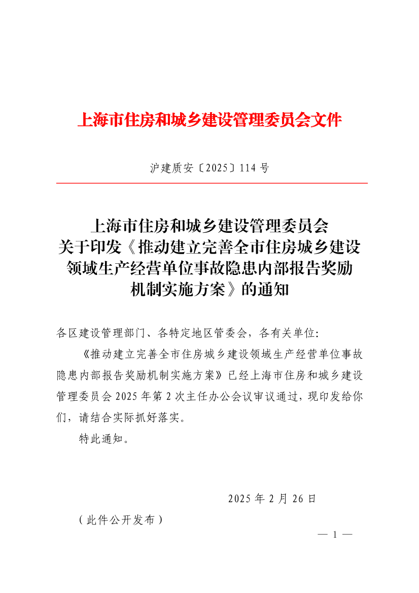 《推动建立完善全市住房城乡建设领域生产经营单位事故隐患内部报告奖励机制实施方案》已经上海市住房和城乡建设管理委员会2025年第2次主任办公会议审议通过,现印发给你们,请结合实际抓好落实。
