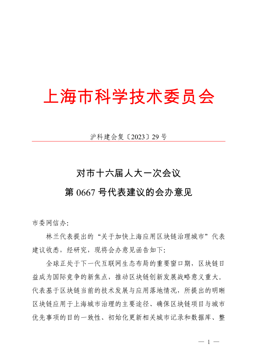 林兰代表提出的“关于加快上海应用区块链治理城市”代表建议收悉,经研究,现将会办意见函告如下: