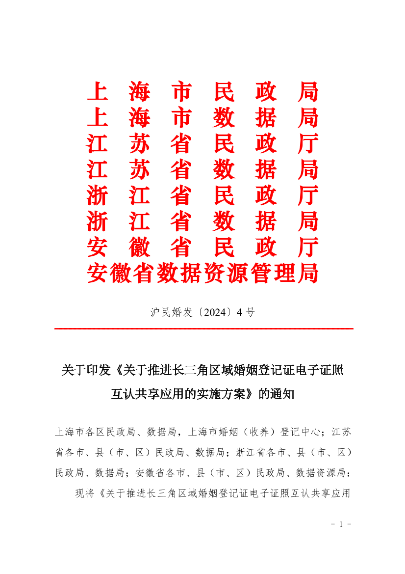 现将《关于推进长三角区域婚姻登记证电子证照互认共享应用的实施方案》印发给你们,请认真按照执行。