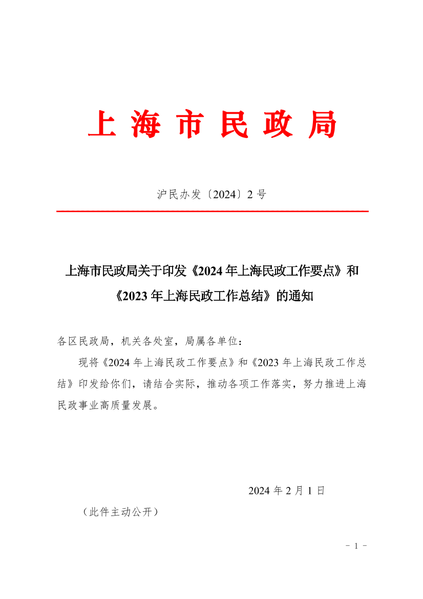 现将《2024年上海民政工作要点》和《2023年上海民政工作总结》印发给你们,请结合实际,推动各项工作落实,努力推进上海民政事业高质量发展。