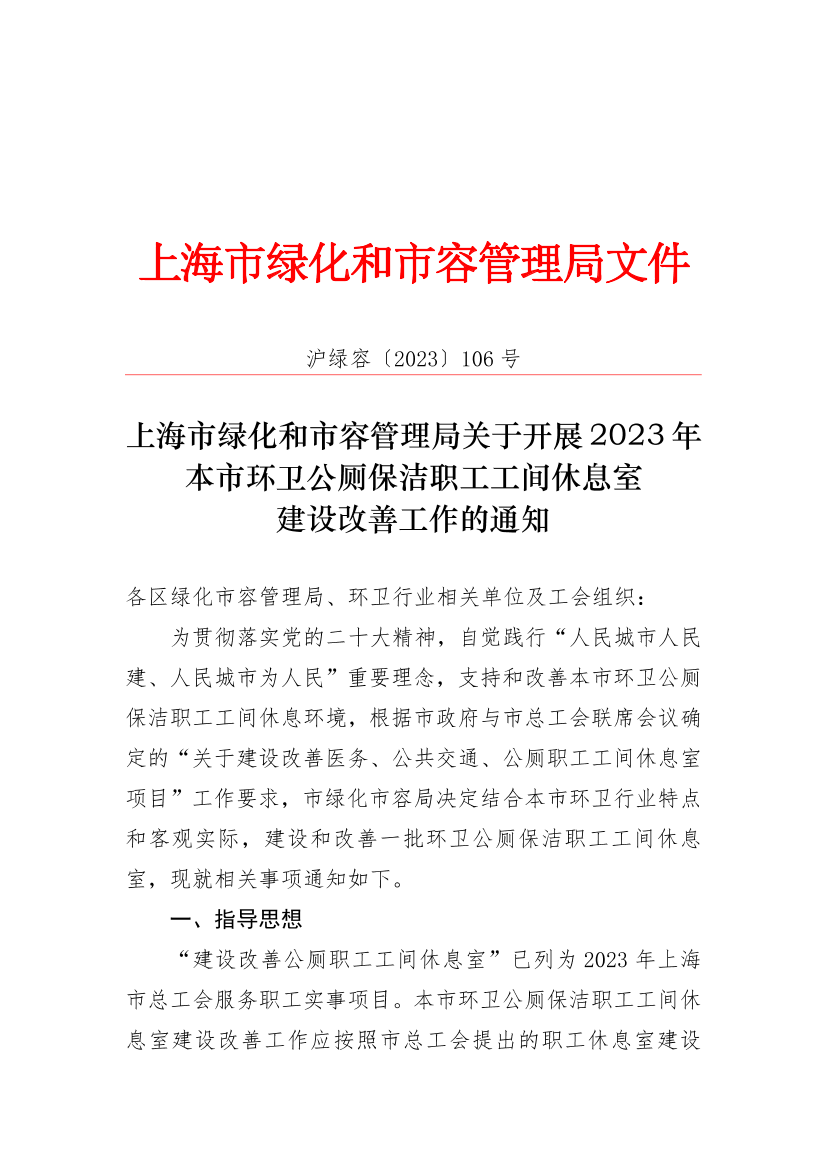 为贯彻落实党的二十大精神,自觉践行“人民城市人民建、人民城市为人民”重要理念,支持和改善本市环卫公厕保洁职工工间休息环境,根据市政府与市总工会联席会议确定的“关于建设改善医务、公共交通、公厕职工工间休息室项目”工作要求,市绿化市容局决定结合本市环卫行业特点和客观实际,建设和改善一批环卫公厕保洁职工工间休息室,现就相关事项通知如下。