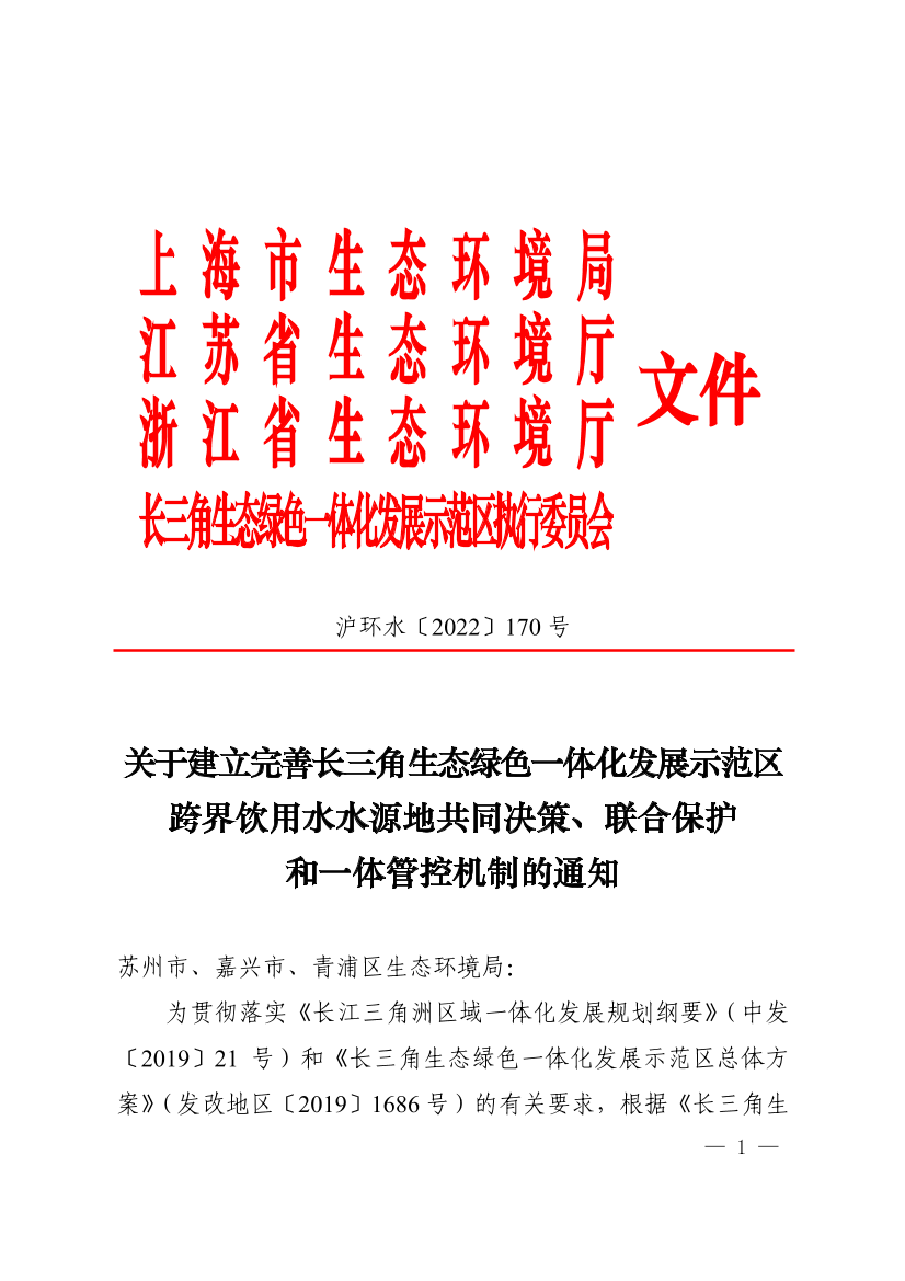 为贯彻落实《长江三角洲区域一体化发展规划纲要》(中发〔2019〕21号)和《长三角生态绿色一体化发展示范区总体方案》(发改地区〔2019〕1686号)的有关要求,根据《长三角生态绿色一体化发展示范区建设2022年重点工作安排及责任分工》(示范区执委会发〔2022〕5号)安排,按照一体化和“一盘棋”的基本原则,在共同推进示范区跨界饮用水水源保护区划完整衔接的基础上,为进一步加大示范区跨界饮用水水源地生态环境保护力度,现就建立完善示范区跨界饮用水水源地共同决策、联合保护和一体管控机制有关工作通知如下: