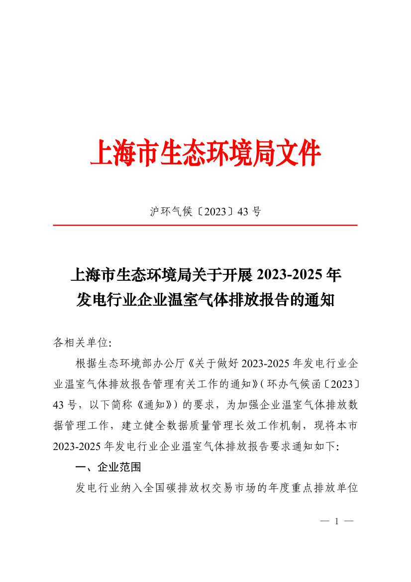 根据生态环境部办公厅《关于做好2023-2025年发电行业企业温室气体排放报告管理有关工作的通知》(环办气候函〔2023〕43号,以下简称《通知》)的要求,为加强企业温室气体排放数据管理工作,建立健全数据质量管理长效工作机制,现将本市2023-2025年发电行业企业温室气体排放报告要求通知如下: