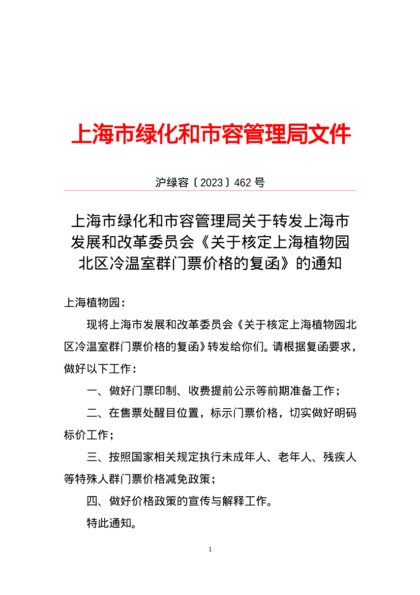 现将上海市发展和改革委员会《关于核定上海植物园北区冷温室群门票价格的复函》转发给你们。请根据复函要求,做好以下工作: