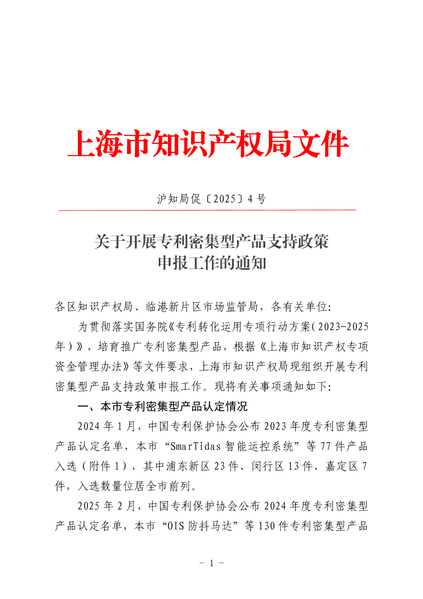 为贯彻落实国务院《专利转化运用专项行动方案(2023-2025年)》,培育推广专利密集型产品,根据《上海市知识产权专项资金管理办法》等文件要求,上海市知识产权局现组织开展专利密集型产品支持政策申报工作。现将有关事项通知如下: