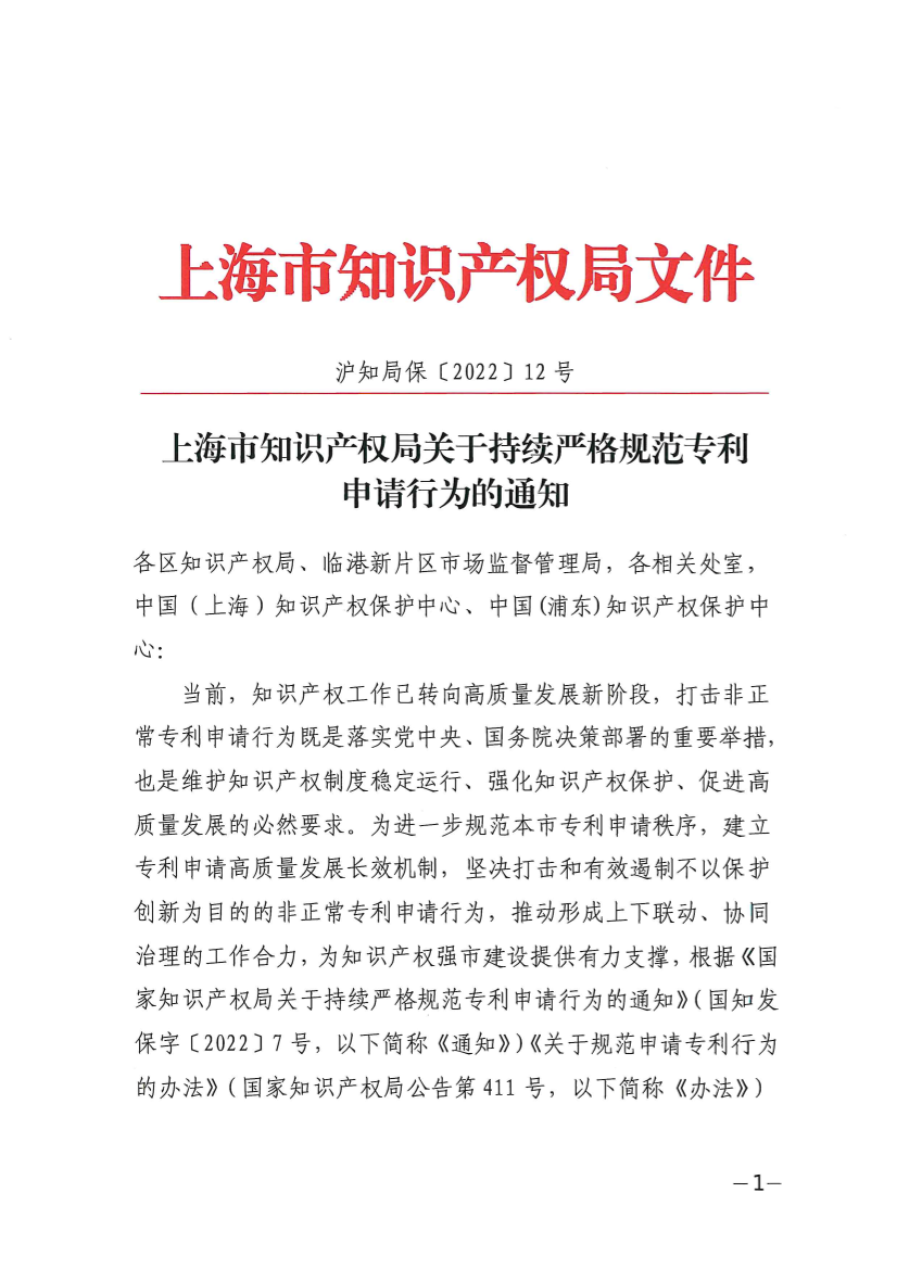 当前,知识产权工作已转向高质量发展新阶段,打击非正常专利申请行为既是落实党中央、国务院决策部署的重要举措,也是维护知识产权制度稳定运行、强化知识产权保护、促进高质量发展的必然要求。为进一步规范本市专利申请秩序,建立专利申请高质量发展长效机制,坚决打击和有效遏制不以保护创新为目的的非正常专利申请行为,推动形成上下联动、协同治理的工作合力,为知识产权强市建设提供有力支撑,根据《国家知识产权局关于持续严格规范专利申请行为的通知》(国知发保字〔2022〕7号,以下简称《通知》)《关于规范申请专利行为的办法》(国家知识产权局公告第411号,以下简称《办法》)精神,现就有关事项通知如下: