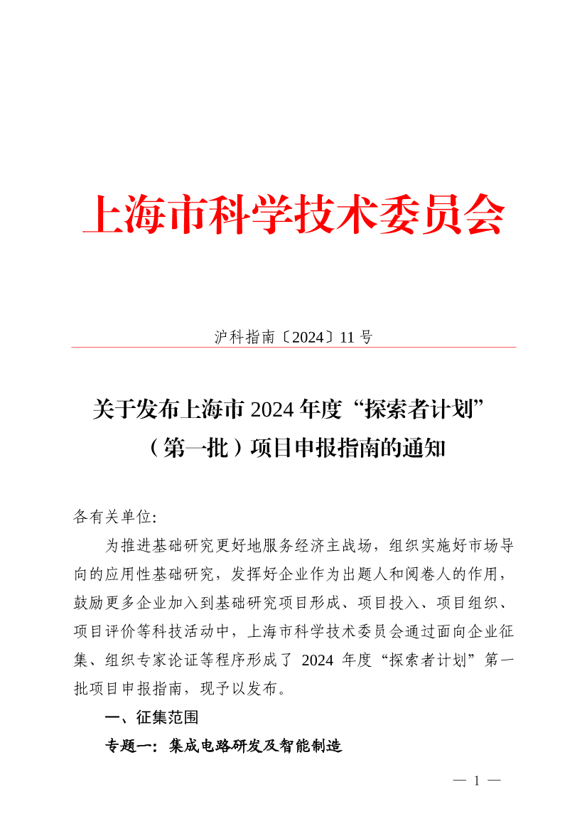 为推进基础研究更好地服务经济主战场,组织实施好市场导向的应用性基础研究,发挥好企业作为出题人和阅卷人的作用,鼓励更多企业加入到基础研究项目形成、项目投入、项目组织、项目评价等科技活动中,上海市科学技术委员会通过面向企业征集、组织专家论证等程序形成了2024年度“探索者计划”第一批项目申报指南,现予以发布。