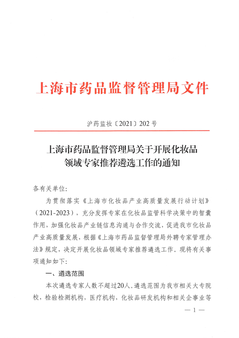 为贯彻落实《上海市化妆品产业高质量发展行动计划》(2021-2023),充分发挥专家在化妆品监管科学决策中的智囊作用,加强化妆品产业链信息沟通与合作交流,促进我市化妆品产业高质量发展,根据《上海市药品监督管理局外聘专家管理办法》规定,决定开展化妆品领域专家推荐遴选工作。现将有关事项通知如下: