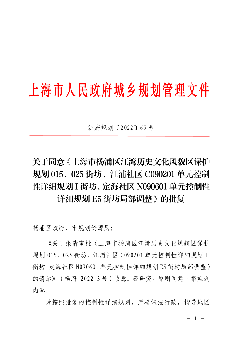 《关于报请审批〈上海市杨浦区江湾历史文化风貌区保护规划015、025街坊、江浦社区C090201单元控制性详细规划I街坊、定海社区N090601单元控制性详细规划E5街坊局部调整〉的请示》(杨府[2022]3号)收悉。经研究,原则同意上报规划内容。