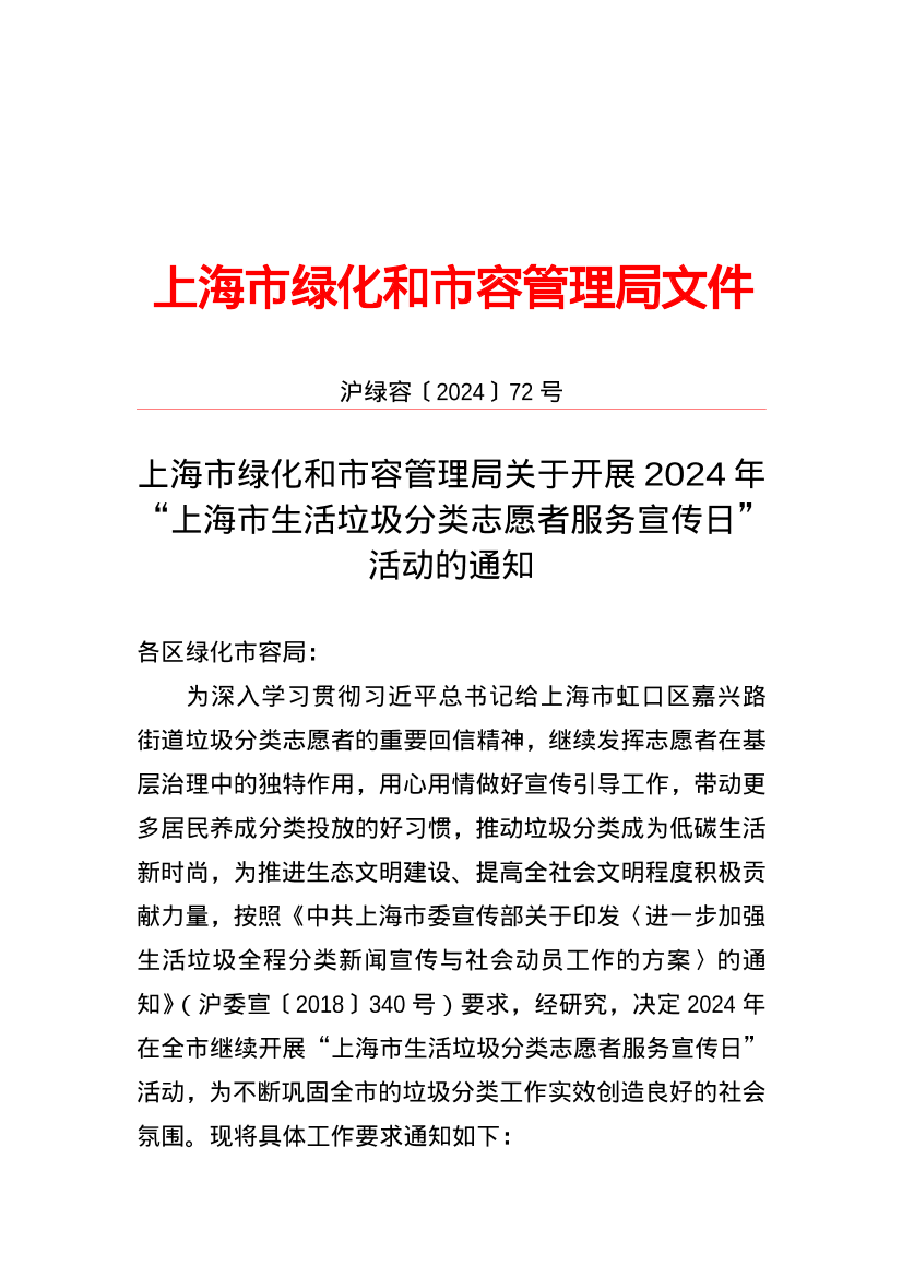 为深入学习贯彻习近平总书记给上海市虹口区嘉兴路街道垃圾分类志愿者的重要回信精神,继续发挥志愿者在基层治理中的独特作用,用心用情做好宣传引导工作,带动更多居民养成分类投放的好习惯,推动垃圾分类成为低碳生活新时尚,为推进生态文明建设、提高全社会文明程度积极贡献力量,按照《中共上海市委宣传部关于印发〈进一步加强生活垃圾全程分类新闻宣传与社会动员工作的方案〉的通知》(沪委宣〔2018〕340号)要求,经研究,决定 2024年在全市继续开展“上海市生活垃圾分类志愿者服务宣传日”活动,为不断巩固全市的垃圾分类工作实效创造良好的社会氛围。现将具体工作要求通知如下: