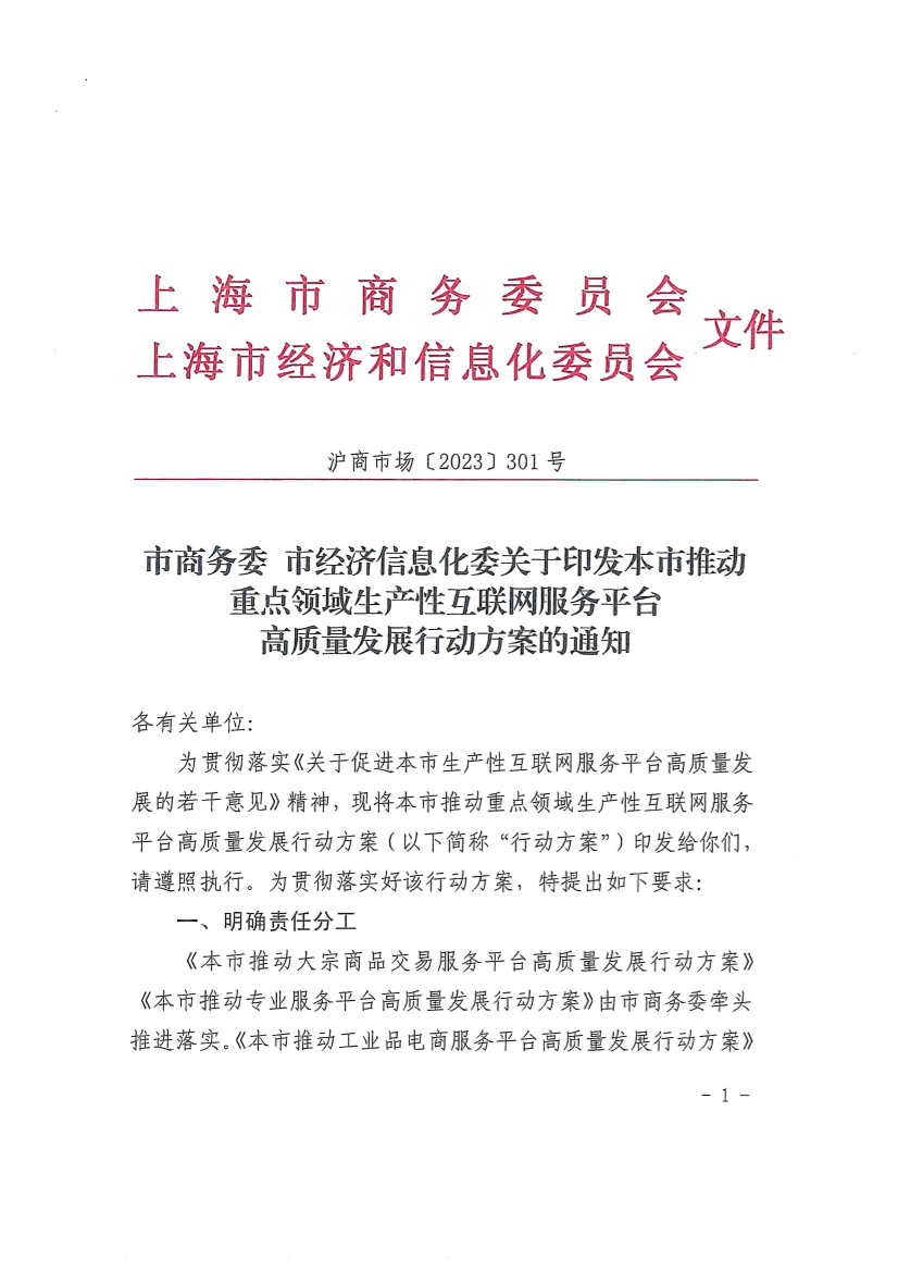 《本市推动大宗商品交易服务平台高质量发展行动方案》《本市推动专业服务平台高质量发展行动方案》由市商务委牵头推进落实。《本市推动工业品电商服务平台高质量发展行动方案》《本市推动数字化转型服务平台高质量发展行动方案》由市经济信息化委牵头推进落实。