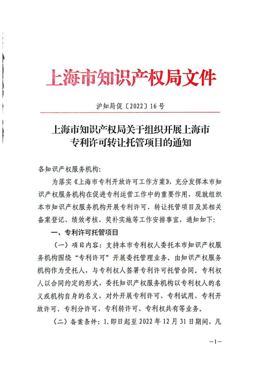 为落实《上海市专利开放许可工作方案》,充分发挥本市知识产权服务机构在促进专利运营工作中的重要作用,现就组织本市知识产权服务机构开展专利许可、转让托管项目及其相关备案登记、绩效考核、奖补实施等工作安排事宜,通知如下: