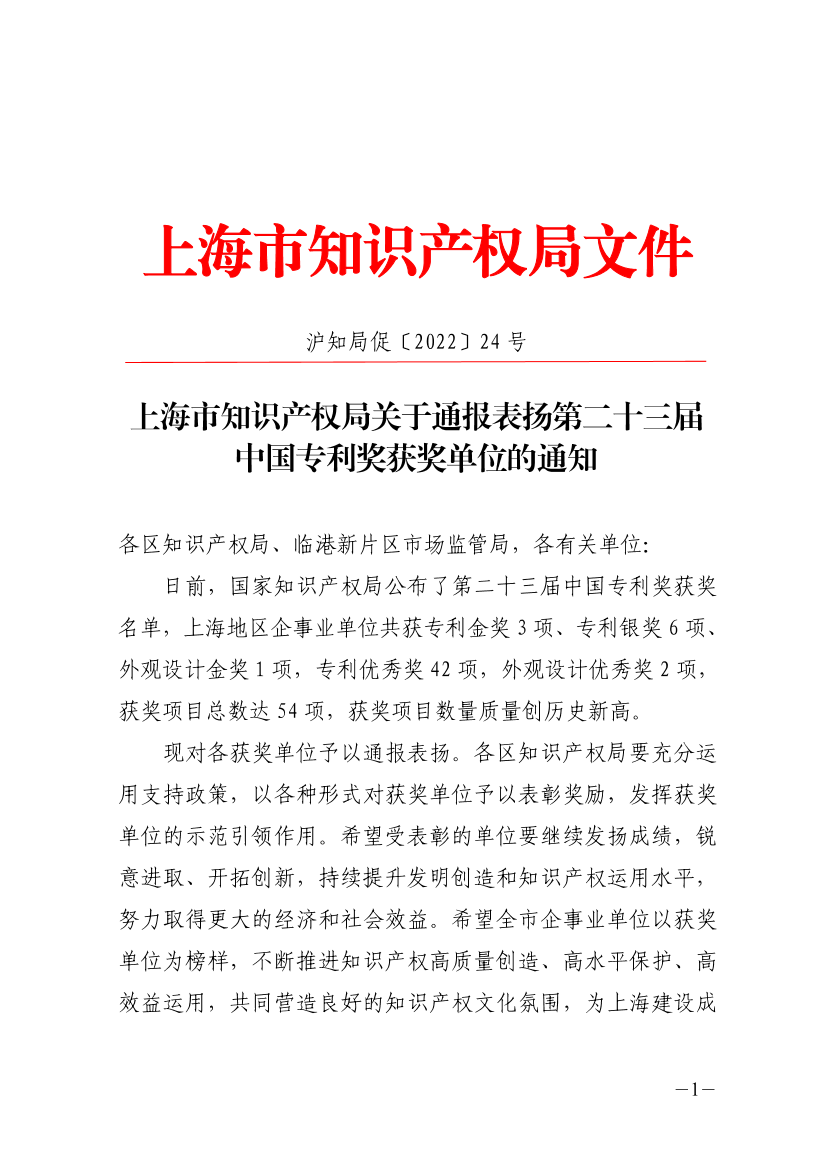 现对各获奖单位予以通报表扬。各区知识产权局要充分运用支持政策,以各种形式对获奖单位予以表彰奖励,发挥获奖单位的示范引领作用。希望受表彰的单位要继续发扬成绩,锐意进取、开拓创新,持续提升发明创造和知识产权运用水平,努力取得更大的经济和社会效益。希望全市企事业单位以获奖单位为榜样,不断推进知识产权高质量创造、高水平保护、高效益运用,共同营造良好的知识产权文化氛围,为上海建设成为具有全球影响力的科技创新中心做出更大的贡献!
