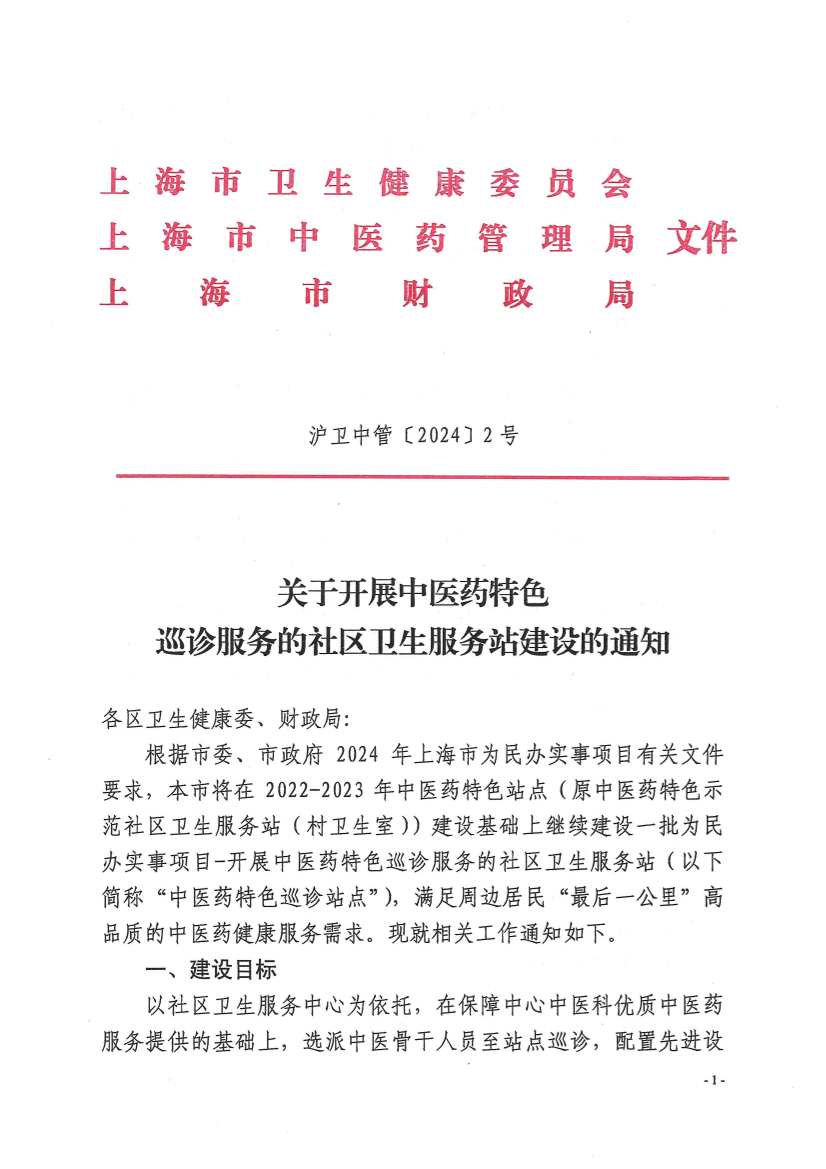 根据市委、市政府2024年上海市为民办实事项目有关文件要求,本市将在2022-2023年中医药特色站点(原中医药特色示范社区卫生服务站(村卫生室))建设基础上继续建设一批为民办实事项目-开展中医药特色巡诊服务的社区卫生服务站(以下简称“中医药特色巡诊站点”),满足周边居民“最后一公里”高品质的中医药健康服务需求。现就相关工作通知如下。