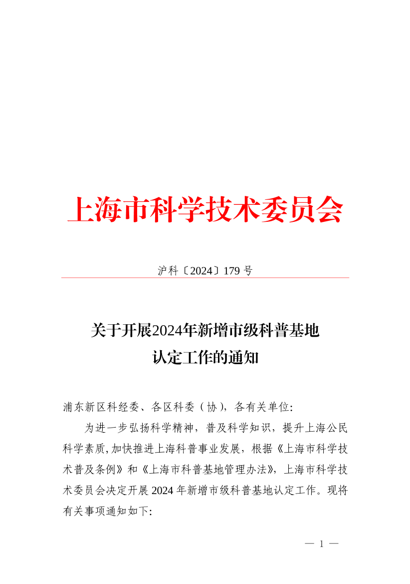 为进一步弘扬科学精神,普及科学知识,提升上海公民科学素质,加快推进上海科普事业发展,根据《上海市科学技术普及条例》和《上海市科普基地管理办法》,上海市科学技术委员会决定开展2024年新增市级科普基地认定工作。现将有关事项通知如下: