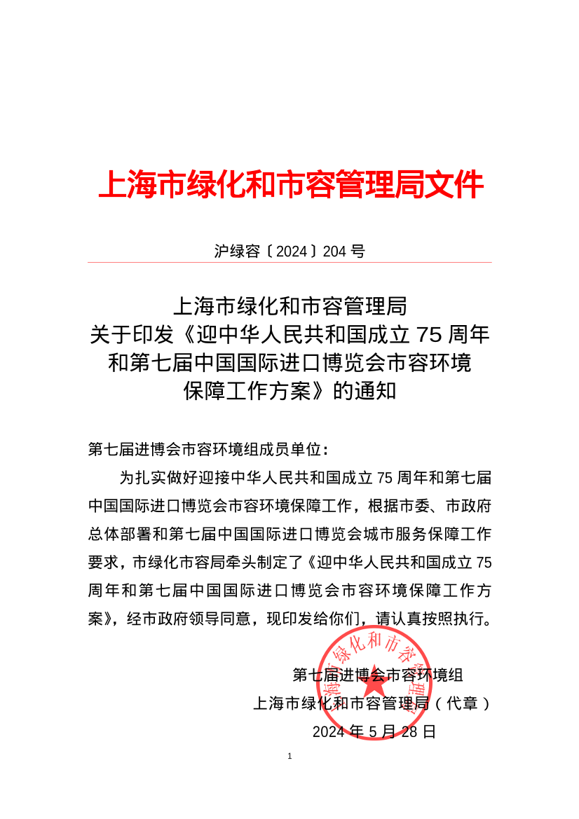 为扎实做好迎接中华人民共和国成立 75周年和第七届中国国际进口博览会市容环境保障工作,根据市委、市政府总体部署和第七届中国国际进口博览会城市服务保障工作要求,市绿化市容局牵头制定了《迎中华人民共和国成立 75周年和第七届中国国际进口博览会市容环境保障工作方案》,经市政府领导同意,现印发给你们,请认真按照执行。