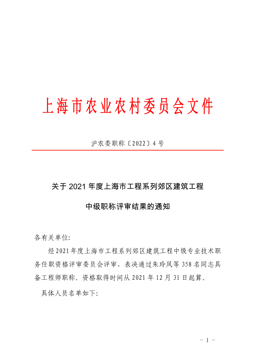 经2021年度上海市工程系列郊区建筑工程中级专业技术职务任职资格评审委员会评审,表决通过朱玲凤等358名同志具备工程师职称。资格取得时间从2021年12月31日起算。