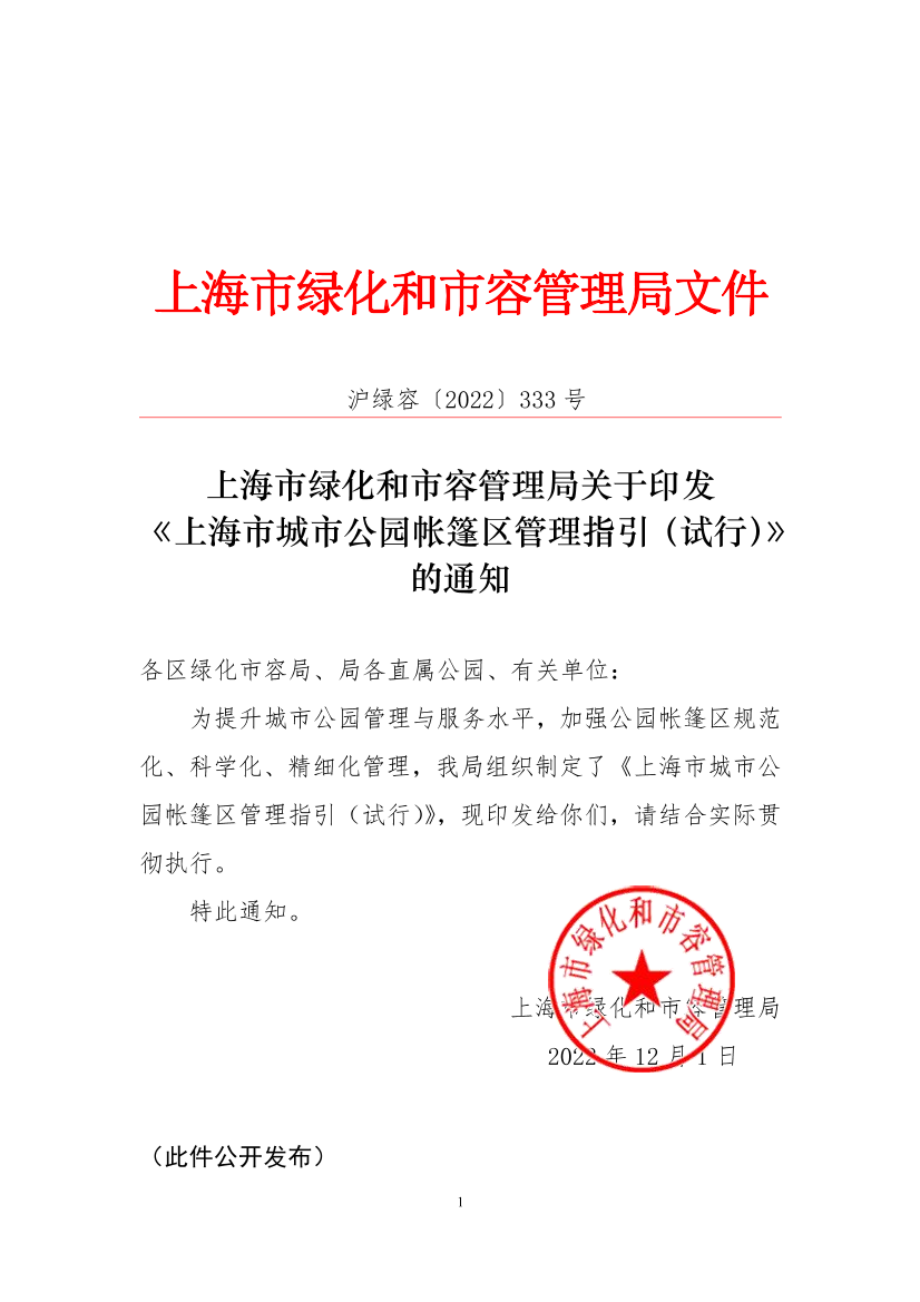 为提升城市公园管理与服务水平,加强公园帐篷区规范化、科学化、精细化管理,我局组织制定了《上海市城市公园帐篷区管理指引(试行)》,现印发给你们,请结合实际贯彻执行。