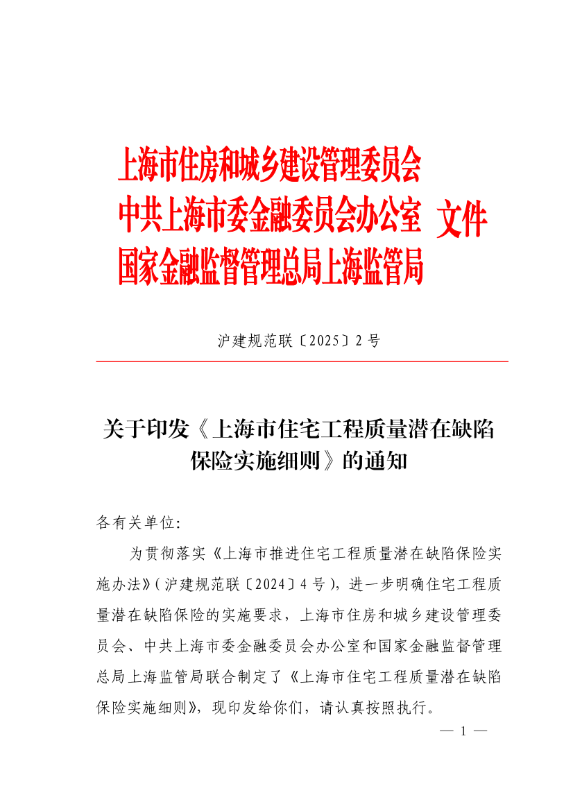 为贯彻落实《上海市推进住宅工程质量潜在缺陷保险实施办法》(沪建规范联〔2024〕4号),进一步明确住宅工程质量潜在缺陷保险的实施要求,上海市住房和城乡建设管理委员会、中共上海市委金融委员会办公室和国家金融监督管理总局上海监管局联合制定了《上海市住宅工程质量潜在缺陷保险实施细则》,现印发给你们,请认真按照执行。