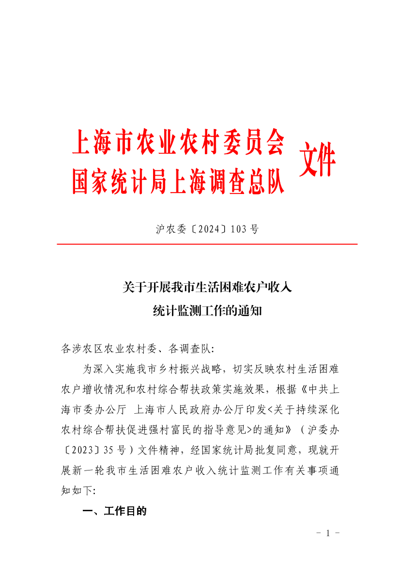 为深入实施我市乡村振兴战略,切实反映农村生活困难农户增收情况和农村综合帮扶政策实施效果,根据《中共上海市委办公厅 上海市人民政府办公厅印发<关于持续深化农村综合帮扶促进强村富民的指导意见>的通知》(沪委办〔2023〕35号)文件精神,经国家统计局批复同意,现就开展新一轮我市生活困难农户收入统计监测工作有关事项通知如下: