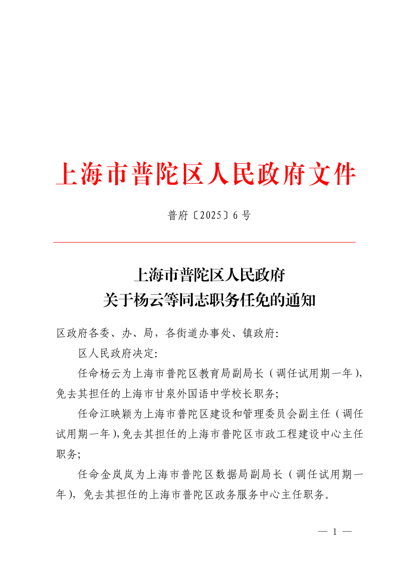 任命金岚岚为上海市普陀区数据局副局长(调任试用期一年),免去其担任的上海市普陀区政务服务中心主任职务。