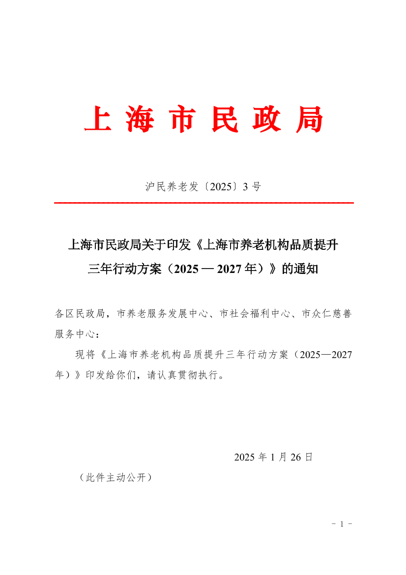 现将《上海市养老机构品质提升三年行动方案(2025—2027年)》印发给你们,请认真贯彻执行。