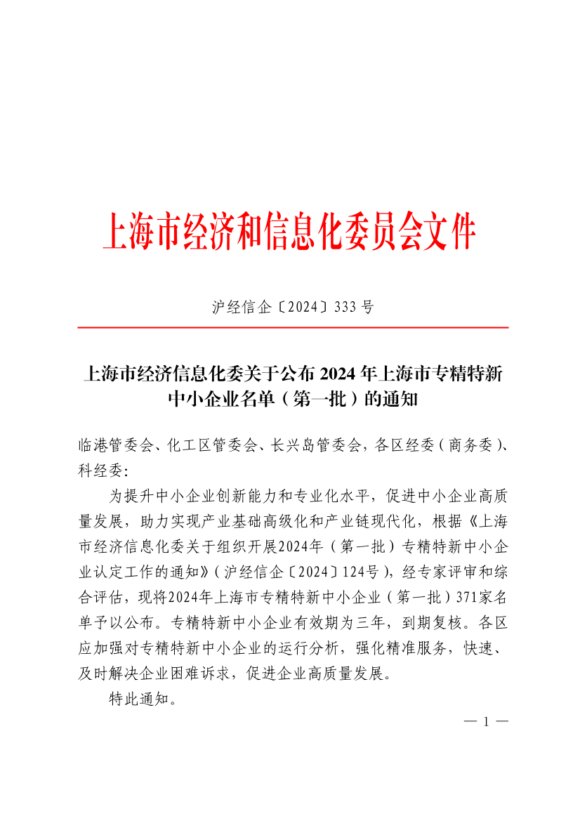 为提升中小企业创新能力和专业化水平,促进中小企业高质量发展,助力实现产业基础高级化和产业链现代化,根据《上海市经济信息化委关于组织开展2024年(第一批)专精特新中小企业认定工作的通知》(沪经信企〔2024〕124号),经专家评审和综合评估,现将2024年上海市专精特新中小企业(第一批)371家名单予以公布。专精特新中小企业有效期为三年,到期复核。各区应加强对专精特新中小企业的运行分析,强化精准服务,快速、及时解决企业困难诉求,促进企业高质量发展。
