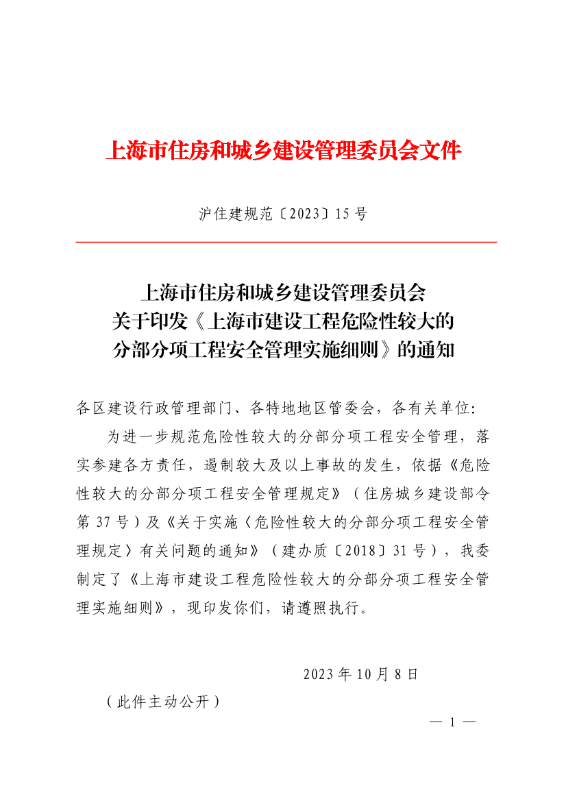关于印发《上海市建设工程危险性较大的分部分项工程安全管理实施细则》的通知