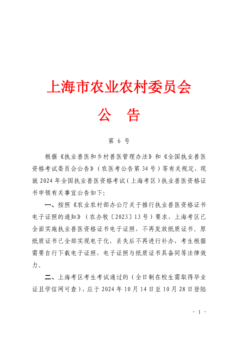 根据《执业兽医和乡村兽医管理办法》和《全国执业兽医资格考试委员会公告》(农医考公告第34号)等有关规定,现就2024年全国执业兽医资格考试(上海考区)执业兽医资格证书申领有关事宜公告如下: