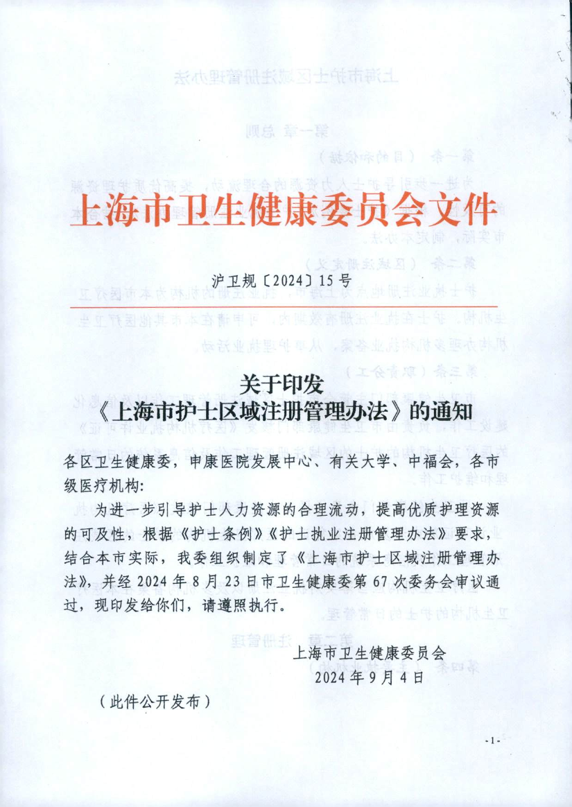 为进一步引导护士人力资源的合理流动,提高优质护理资源的可及性,根据《护士条例》《护士执业注册管理办法》要求,结合本市实际,我委组织制定了《上海市护士区域注册管理办法》,并经2024年8月23日市卫生健康委第67次委务会审议通过,现印发给你们,请遵照执行。