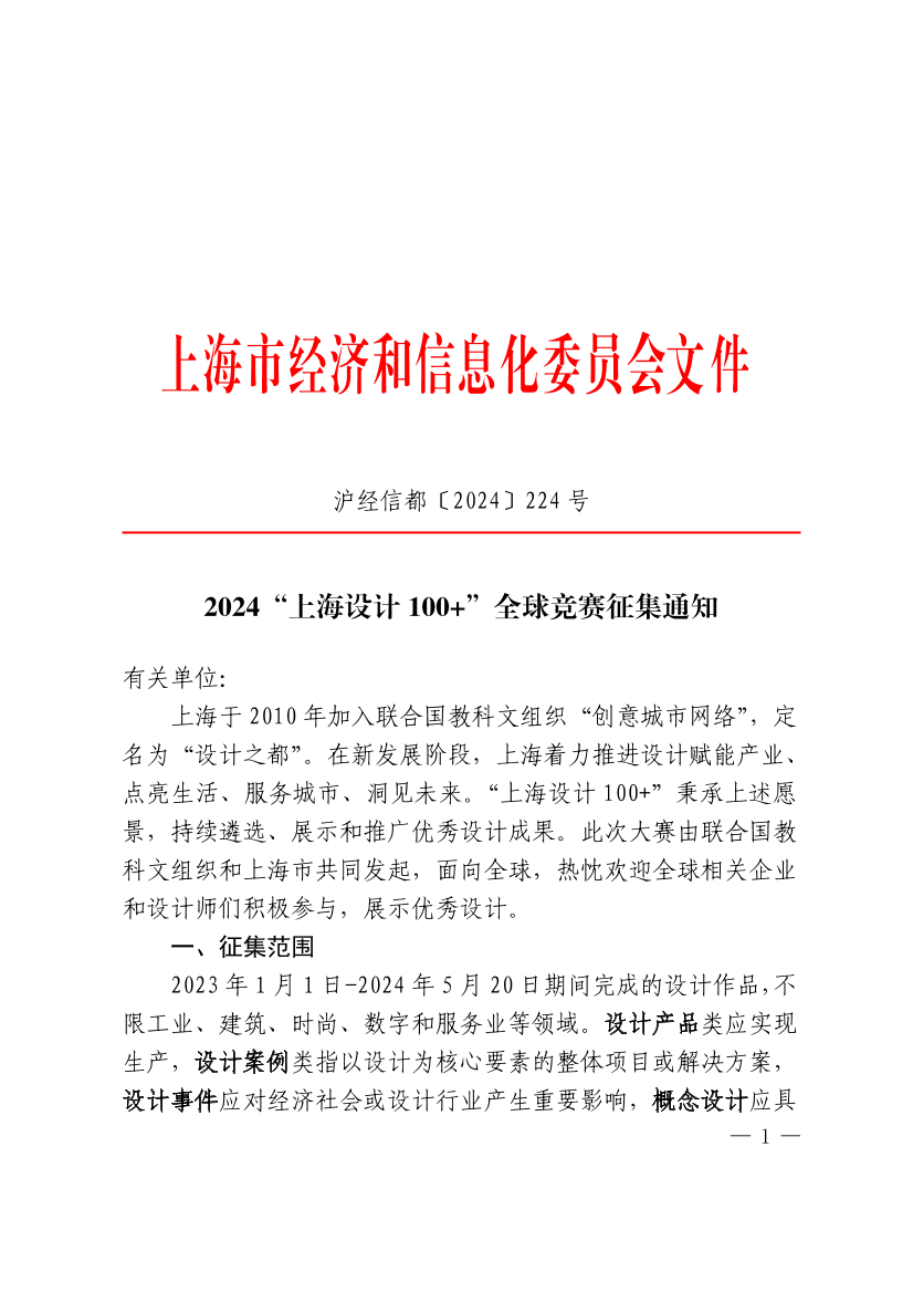 上海于2010年加入联合国教科文组织“创意城市网络”,定名为“设计之都”。在新发展阶段,上海着力推进设计赋能产业、点亮生活、服务城市、洞见未来。“上海设计100+”秉承上述愿景,持续遴选、展示和推广优秀设计成果。此次大赛由联合国教科文组织和上海市共同发起,面向全球,热忱欢迎全球相关企业和设计师们积极参与,展示优秀设计。