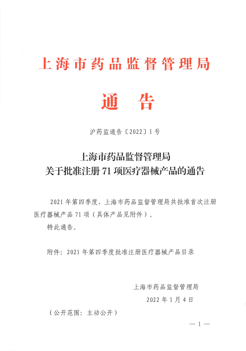 2021年第四季度,上海市药品监督管理局共批准首次注册医疗器械产品71项(具体产品见附件)。