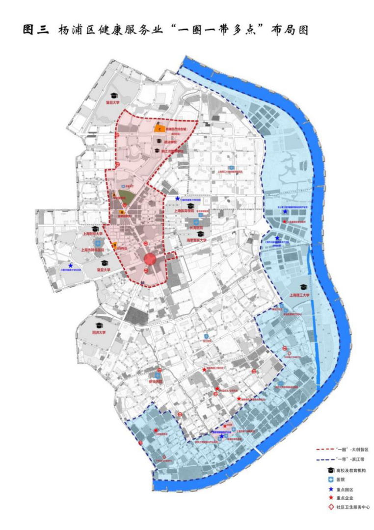 1.统筹推进健康服务业集聚区布局。按照“发挥优势、突出特色、分工合理、协作共赢”的原则,构建杨浦“一圈一带多点”的健康服务业集聚发展布局。推进“一圈”——大创智“智慧医疗”建设,聚焦健康服务业总部经济建设、开展产业链和医疗服务链协同创新、技术支撑平台和产业政策创新,打造全区健康服务产业的驱动核。推进“一带”——杨浦滨江带建设,打造为人民的全生命周期提供全过程、系统连续健康服务的城区健康治理新模式。在“多点”——相关产业园区,筛选一批效益好、技术强、潜力大的健康服务企业入驻。在环复旦、上理工、同济、上财大等高校科技园区,开展医工交叉、体医结合、健康金融等特色化健康服务业发展。