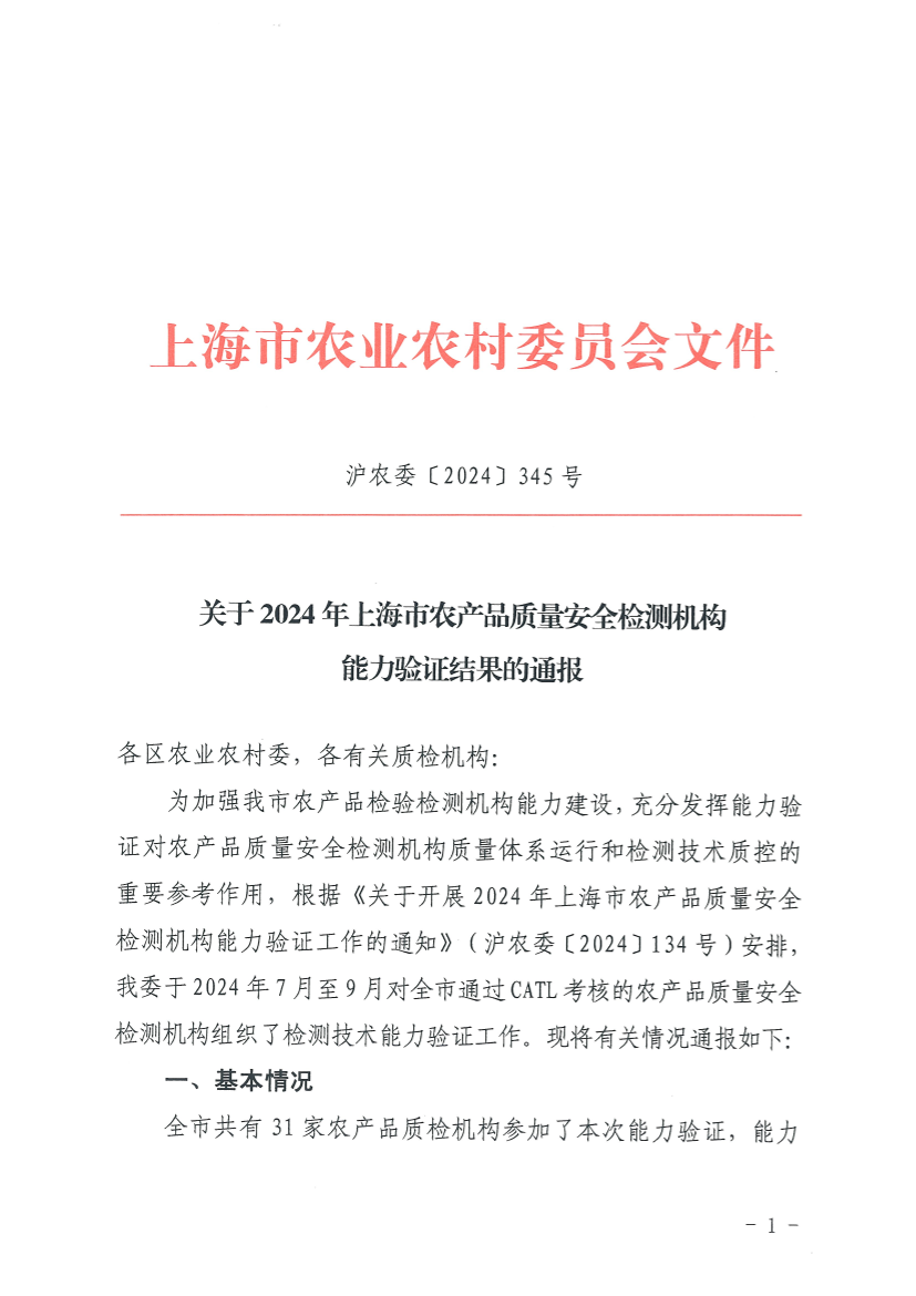 为加强我市农产品检验检测机构能力建设,充分发挥能力验证对农产品质量安全检测机构质量体系运行和检测技术质控的重要参考作用,根据《关于开展2024年上海市农产品质量安全检测机构能力验证工作的通知》(沪农委〔2024〕134号)安排,我委于2024年7月至9月对全市通过CATL考核的农产品质量安全检测机构组织了检测技术能力验证工作。现将有关情况通报如下: