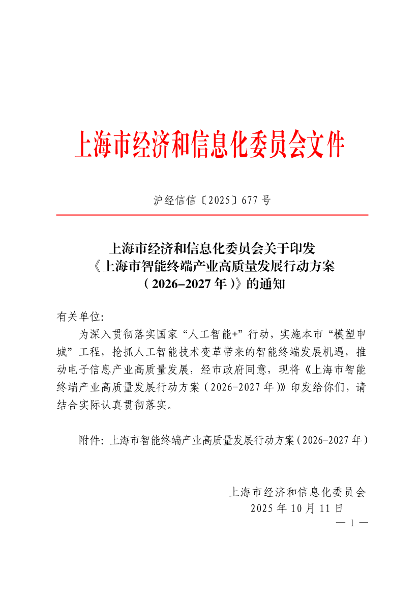 为深入贯彻落实国家“人工智能+”行动,实施本市“模塑申城”工程,抢抓人工智能技术变革带来的智能终端发展机遇,推动电子信息产业高质量发展,经市政府同意,现将《上海市智能终端产业高质量发展行动方案(2026-2027年)》印发给你们,请结合实际认真贯彻落实。